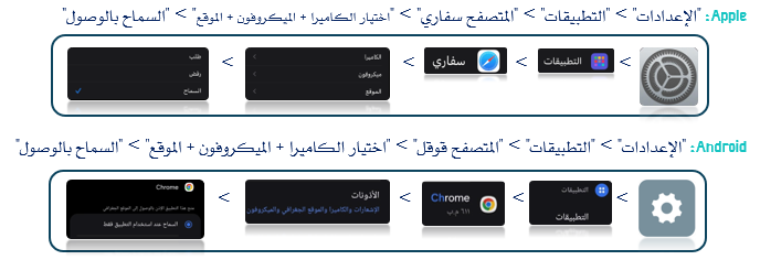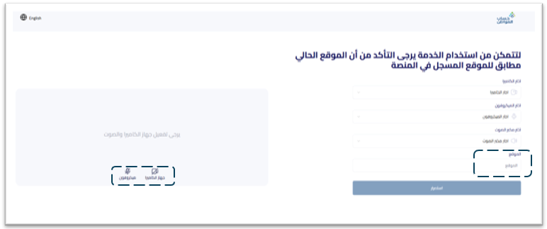 6- بعد الموافقة، تظهر صفحة التحقق من الموقع، ويجب على المستفيد تفعيل الكاميرا والميكروفون وصلاحية الموقع لبدء الزيارة.